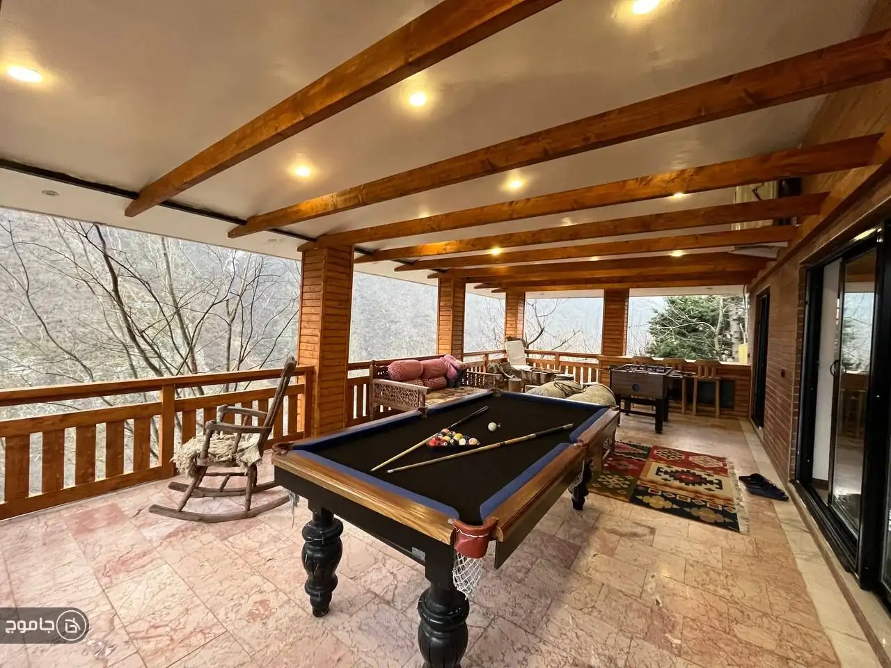 یکی از چشمگیرترین بخشهای ویلا، بالکن بزرگ 50 متری آن است که چشمانداز فوقالعادهای رو به جنگل و رودخانه دارد. نشستن در این بالکن و گوش دادن به صدای دلنشین آب، تجربهای سرشار از آرامش و حال خوب ایجاد میکند.